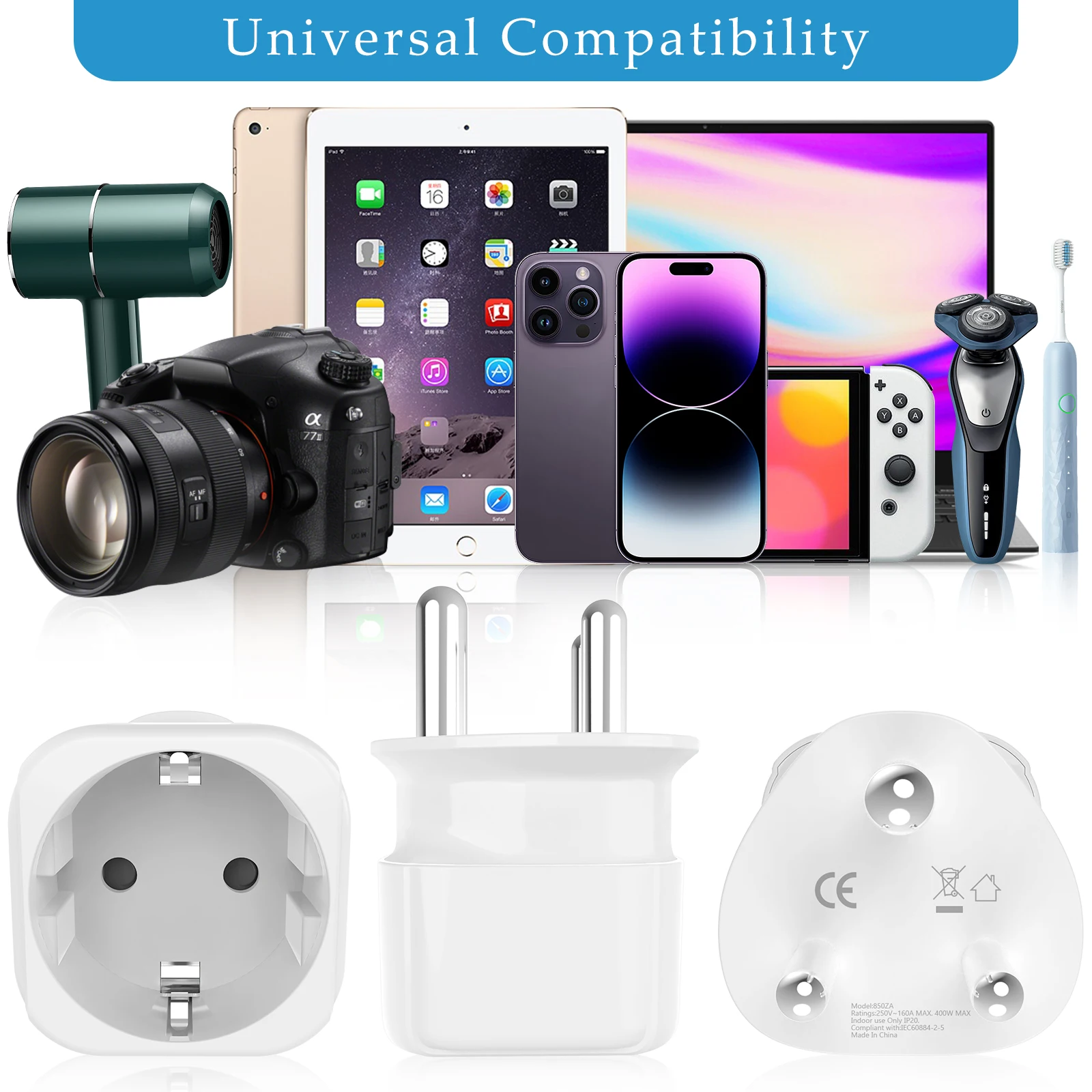 5. Europe to South Africa adapter: the adapter has a rated power of 4000 W (max. 250V, 16A) Compatible with most electronic devices such as cameras, smartphones, iPads, MacBooks, shavers, power banks, toothbrushes, etc.