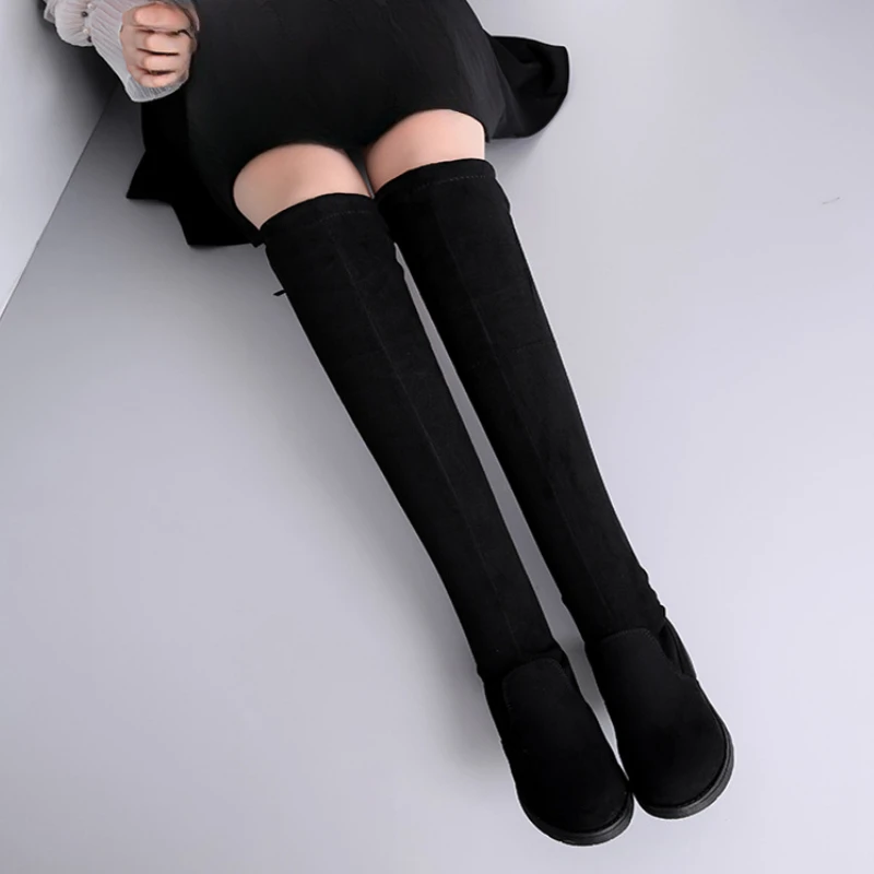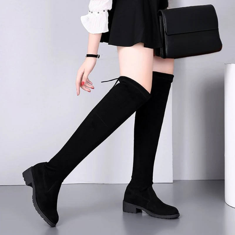 Faux Suede Female Heels Autumn Zipper Elastic Knee-high Boots for Women Tube Lace-up Thigh Gigh Boots Black Botas Mujer
