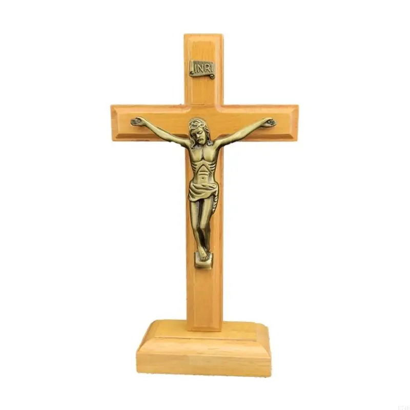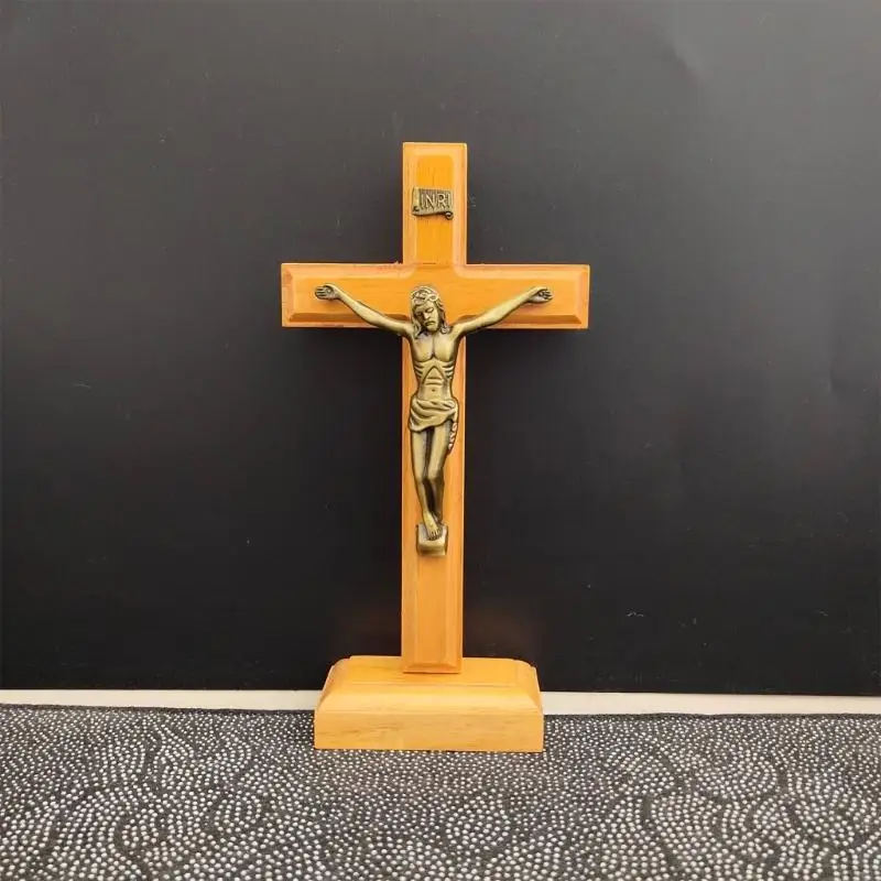 Beautifully designed crucifix cross with stand, suitable for standing on a table or shelf.